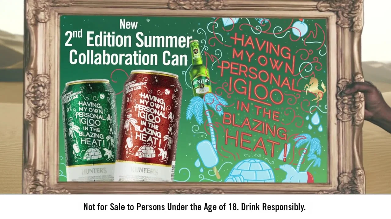 To launch the feeling of Hunter's #InstantRequenchment to the public, we asked them to tell us exactly what an ice old refreshing Hunter's felt like to them. Collaborating with some of South Africa's top illustrators we took their expressions and turned them in to visual expressions with the top voted pieces becoming limited edition cans for the summer as well as becoming prized Hunter's merchandice.